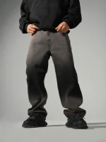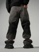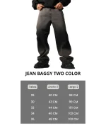 Jean clásico, con corte baggy recto, dos bolsillo traseros, con cuero impactante en la parte trasera, con boton de metal personalizado lleva un focalizado en la parte inferior Y superior creando un contraste moderno y llamativo.